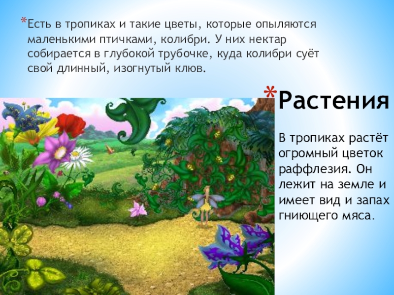 В тропиках растёт огромный цветок раффлезия. Он лежит на земле и имеет вид и запах гниющего мяса.