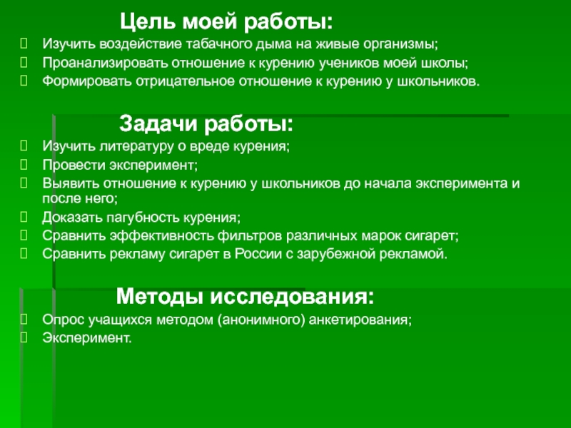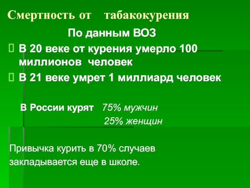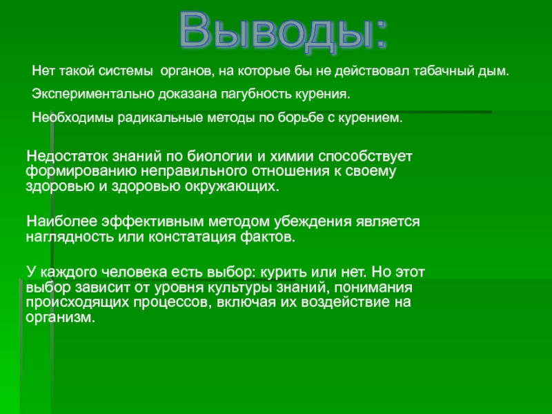 У каждого человека есть выбор: курить или нет. Но этот выбор зависит от уровня культуры знаний, понимания происходящих процессов, включая их воздействие на организм.