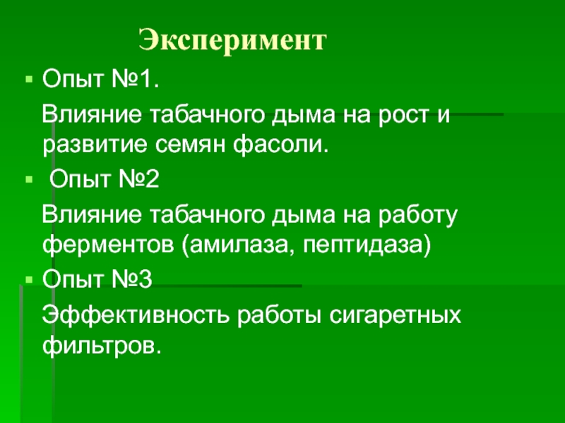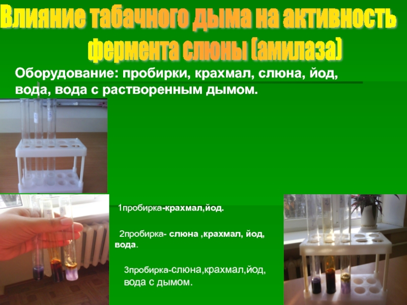 3пробирка-слюна,крахмал,йод,вода с дымом.