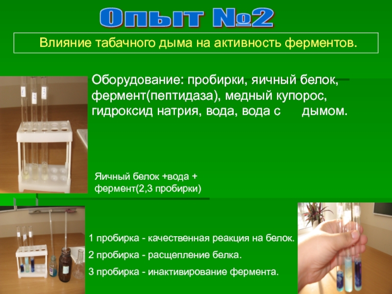 Оборудование: пробирки, яичный белок, фермент(пептидаза), медный купорос,гидроксид натрия, вода, вода с дымом.