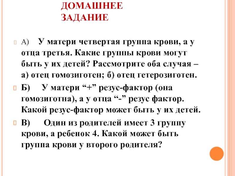 1) Мать имеет вторую группу крови (гомозигота), а отец первую. Какая группа крови может быть у их детей? Рассмотрите оба случая. (2)