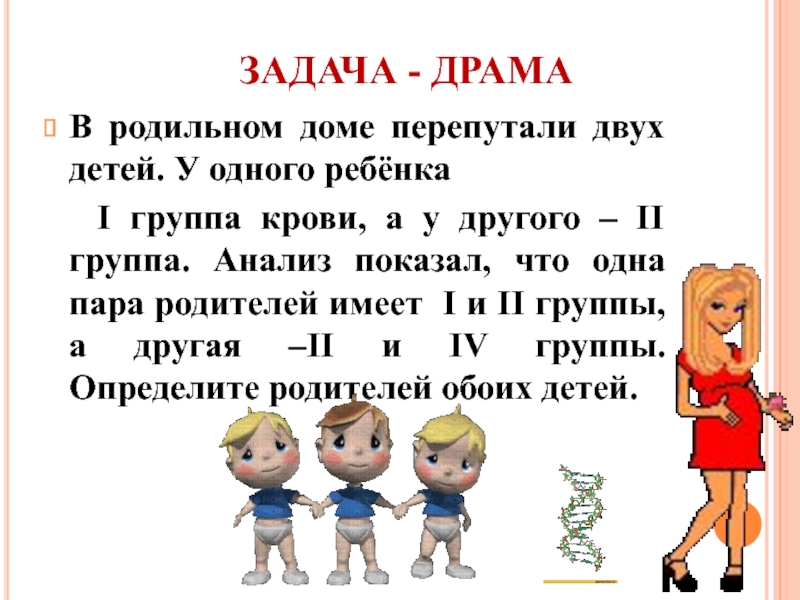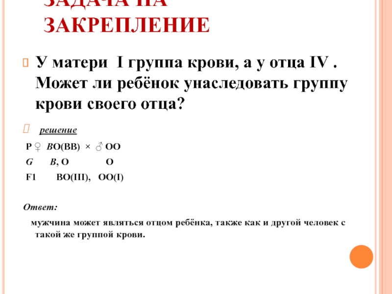 4) Отец имеет первую группу крови, мать – четвертую, их дочь – третью. Родной ли приходится девочка родителям? (3)