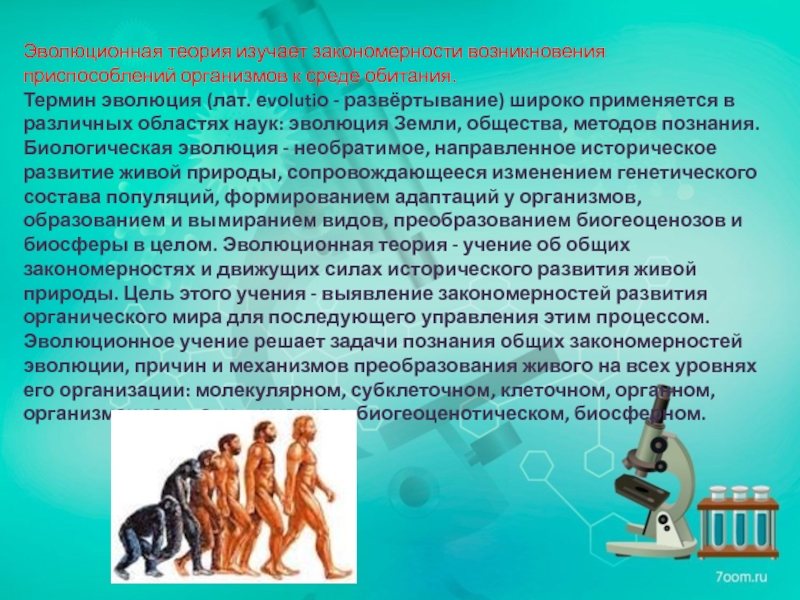 (лат. еvоlutiо - развёртывание) широко применяется в различных областях наук: эволюция Земли, общества, методов познания. Биологическая эволюция - необратимое, направленное историческое развитие живой природы, сопровождающееся изменением генетического состава популяций, формированием адаптаций у организмов, образованием и вымиранием видов, преобразованием биогеоценозов и биосферы в целом. Эволюционная теория - учение об общих закономерностях и движущих силах исторического развития живой природы. Цель этого учения - выявление закономерностей развития органического мира для последующего управления этим процессом. Эволюционное учение решает задачи познания общих закономерностей эволюции, причин и механизмов преобразования живого на всех уровнях его организации: молекулярном, субклеточном, клеточном, органном, организменном, популяционном, биогеоценотическом, биосферном.