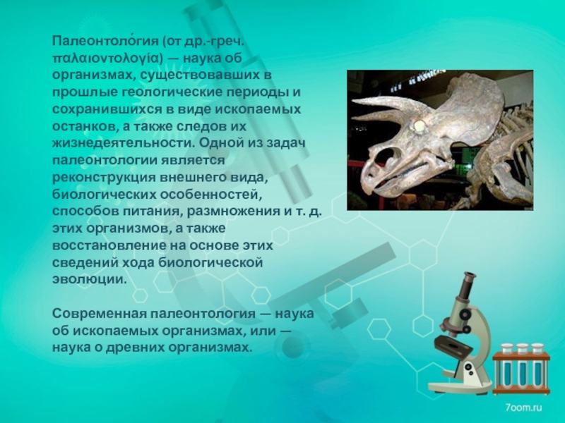 Слайд 7Палеонтоло́гия (от др.-греч. παλαιοντολογία) — наука об организмах, существовавших в прошлые