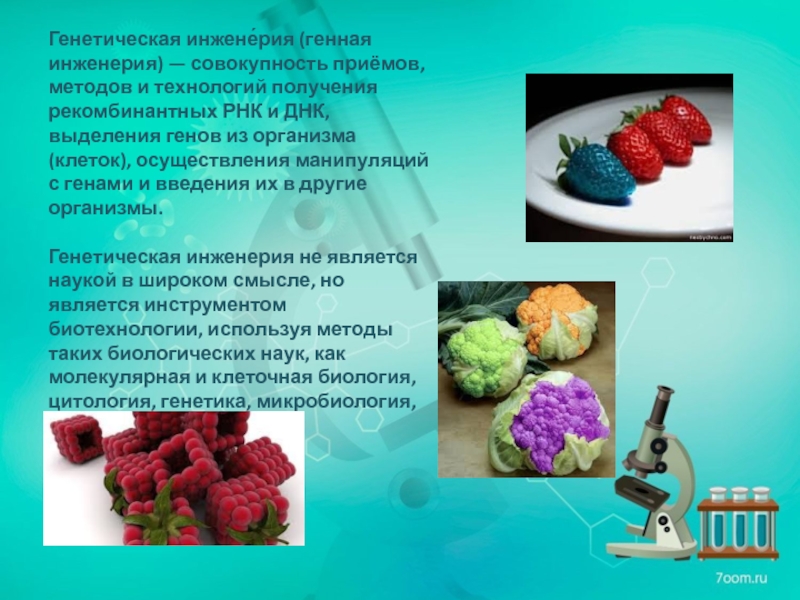 Слайд 9Генетическая инжене́рия (генная инженерия) — совокупность приёмов, методов и технологий получения