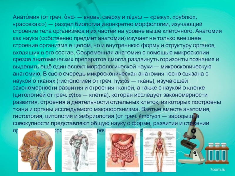 «рублю», «рассекаю») — раздел биологии и конкретно морфологии, изучающий строение тела организмов и их частей на уровне выше клеточного. Анатомия как наука (собственно предмет анатомии) изучает не только внешнее строение организма в целом, но и внутреннюю форму и структуру органов, входящих в его состав. Современная анатомия с помощью микроскопии срезов анатомических препаратов смогла раздвинуть горизонты познания и выделить ещё один аспект морфологической науки — микроскопическую анатомию. В свою очередь микроскопическая анатомия тесно связана с наукой о тканях (гистологией от греч. hystós — ткань), изучающей закономерности развития и строения тканей, а также с наукой о клетке (цитологией от греч. cýtos — клетка), которая исследует закономерности развития, строения и деятельности отдельных клеток, из которых построены ткани и органы исследуемого макроорганизма. Взятые вместе анатомия, гистология, цитология и эмбриология (от греч. émbryon — зародыш) в совокупности представляют общую науку о форме, развитии и строении организма — морфологию (от греч. morphé — форма).