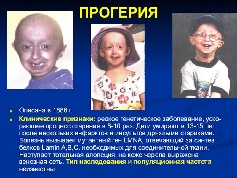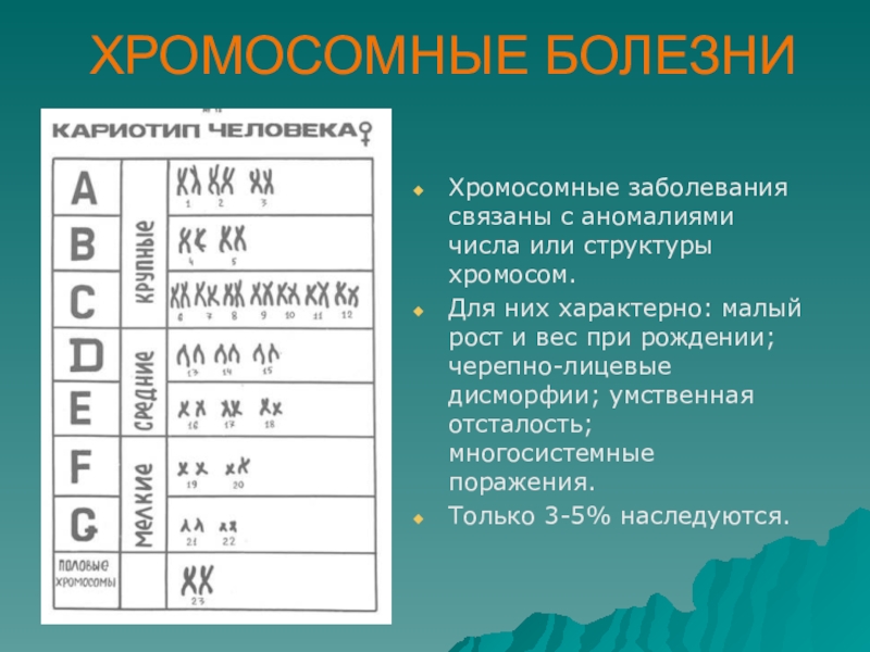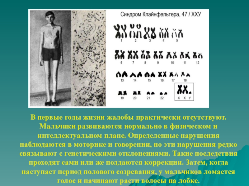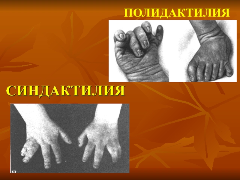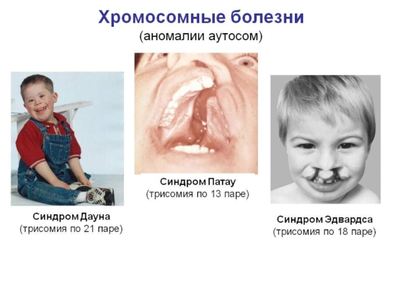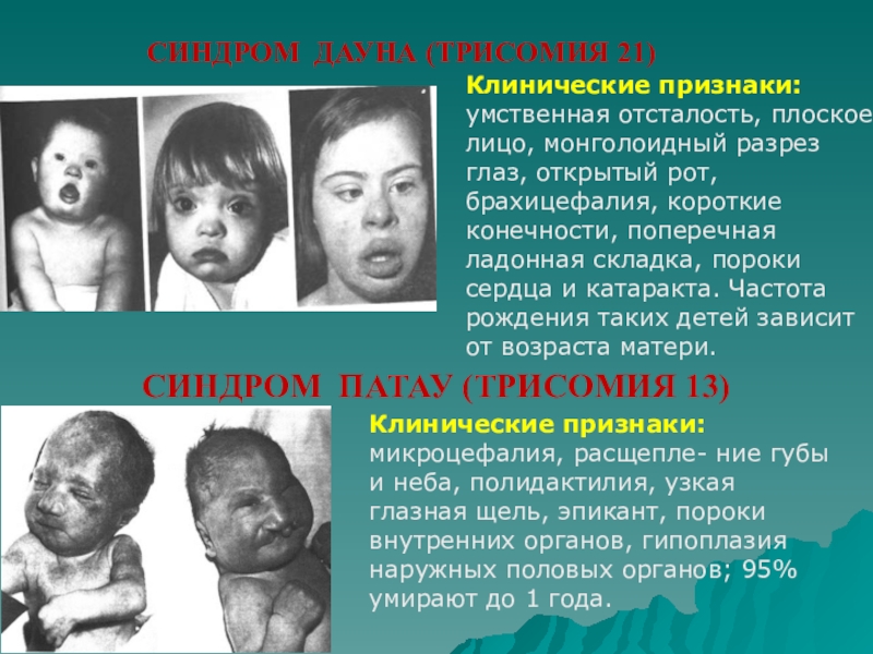 Клинические признаки: микроцефалия, расщепле- ние губы и неба, полидактилия, узкая глазная щель, эпикант, пороки внутренних органов, гипоплазия наружных половых органов; 95% умирают до 1 года.