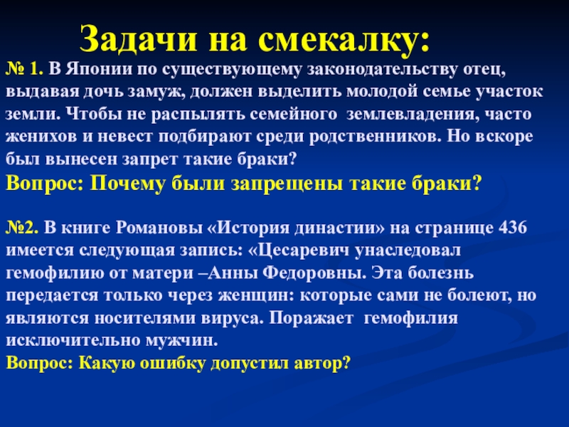 №2. В книге Романовы «История династии» на странице 436 имеется следующая запись: «Цесаревич унаследовал гемофилию от матери –Анны Федоровны. Эта болезнь передается только через женщин: которые сами не болеют, но являются носителями вируса. Поражает гемофилия исключительно мужчин.
