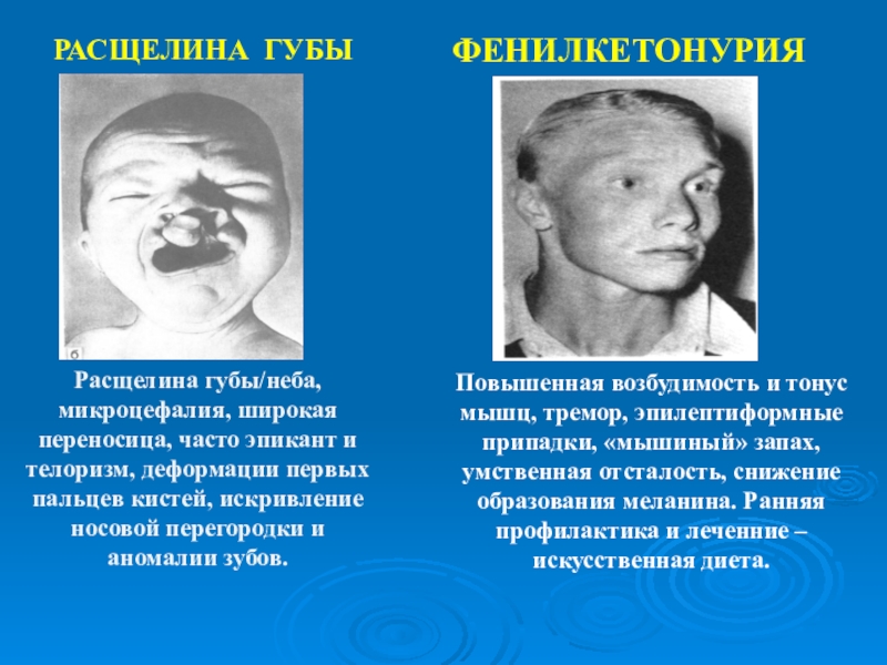 Повышенная возбудимость и тонус мышц, тремор, эпилептиформные припадки, «мышиный» запах, умственная отсталость, снижение образования меланина. Ранняя профилактика и леченние – искусственная диета.