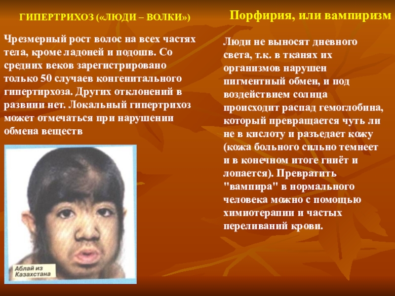 Люди не выносят дневного света, т.к. в тканях их организмов нарушен пигментный обмен, и под воздействием солнца происходит распад гемоглобина, который превращается чуть ли не в кислоту и разъедает кожу (кожа больного сильно темнеет и в конечном итоге гниёт и лопается). Превратить "вампира" в нормального человека можно с помощью химиотерапии и частых переливаний крови.
