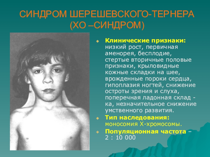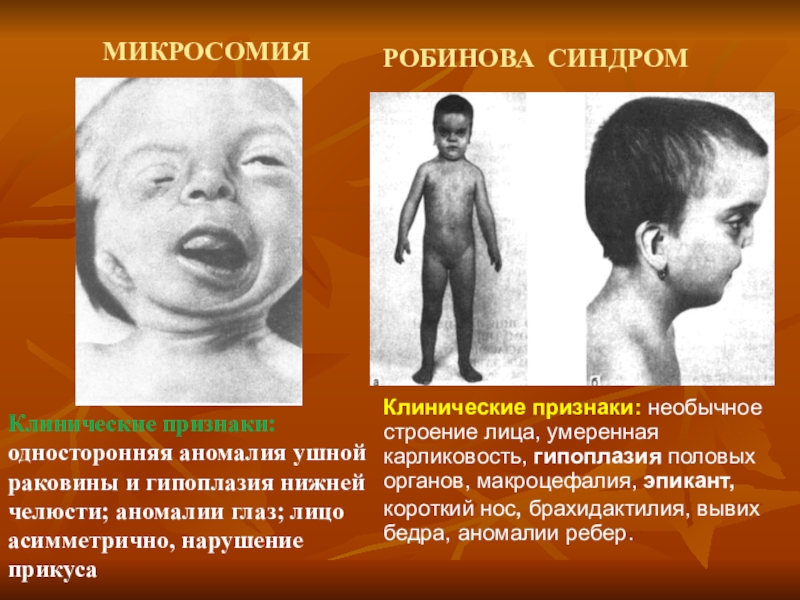 Клинические признаки: необычное строение лица, умеренная карликовость, гипоплазия половых органов, макроцефалия, эпикант,