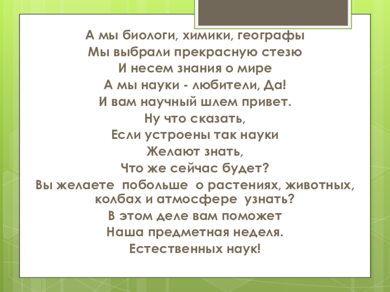 А мы биологи, химики, географыМы выбрали прекрасную стезюИ несем знания о мире А мы науки - любители,