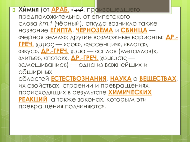 Слайд 7Хи́мия (от араб. کيمياء‎‎, произошедшего, предположительно, от египетского слова km.t (чёрный), откуда возникло также название Египта, чернозёма и свинца — «черная