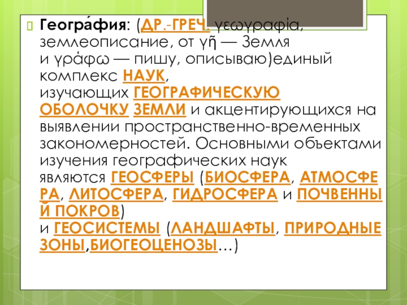 Слайд 5Геогра́фия: (др.-греч. γεωγραφία, землеописание, от γῆ — Земля и γράφω — пишу, описываю)единый комплекс наук, изучающих географическую оболочку Земли и
