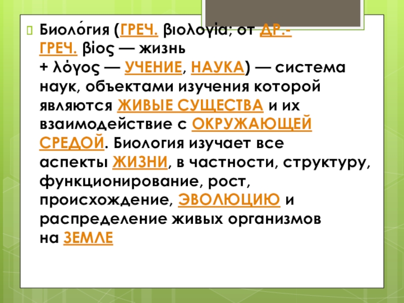 Слайд 3Биоло́гия (греч. βιολογία; от др.-греч. βίος — жизнь + λόγος — учение, наука) — система наук, объектами изучения которой являются живые существа и