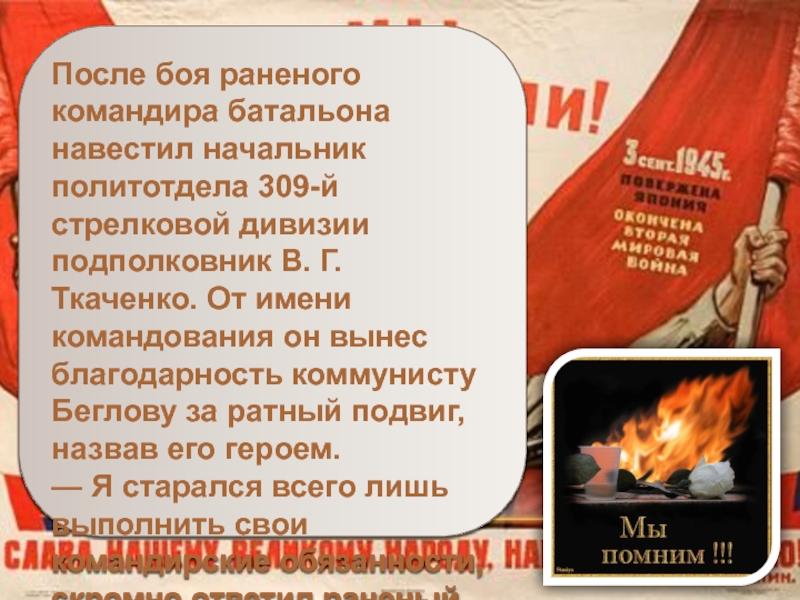 подполковник В. Г. Ткаченко. От имени командования он вынес благодарность коммунисту Беглову за ратный подвиг, назвав его героем.
