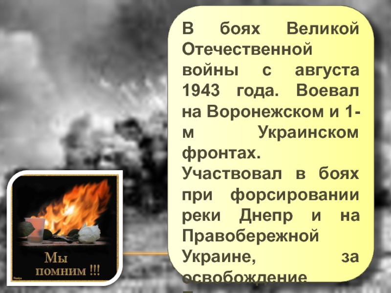 Слайд 7В боях Великой Отечественной войны с августа 1943 года. Воевал на