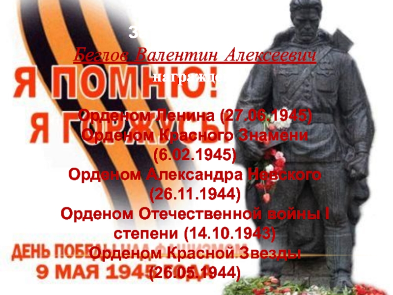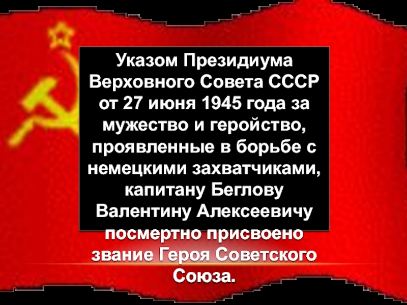мужество и геройство, проявленные в борьбе с немецкими захватчиками, капитану Беглову Валентину Алексеевичу посмертно присвоено звание Героя Советского Союза.