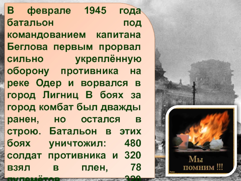 Слайд 9В феврале 1945 года батальон под командованием капитана Беглова первым прорвал