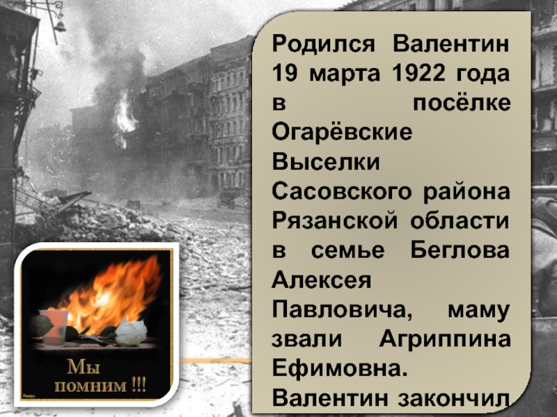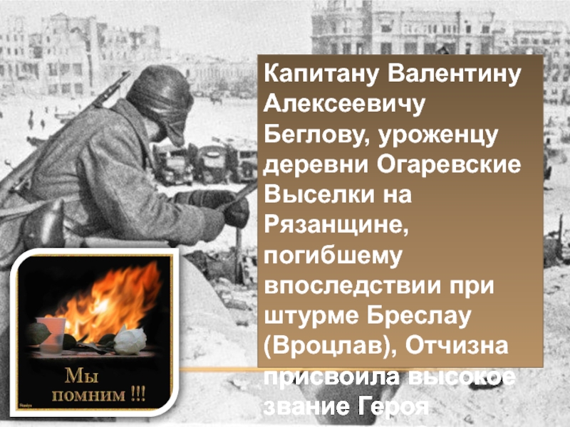 Слайд 15Капитану Валентину Алексеевичу Беглову, уроженцу деревни Огаревские Выселки на Рязанщине, погибшему