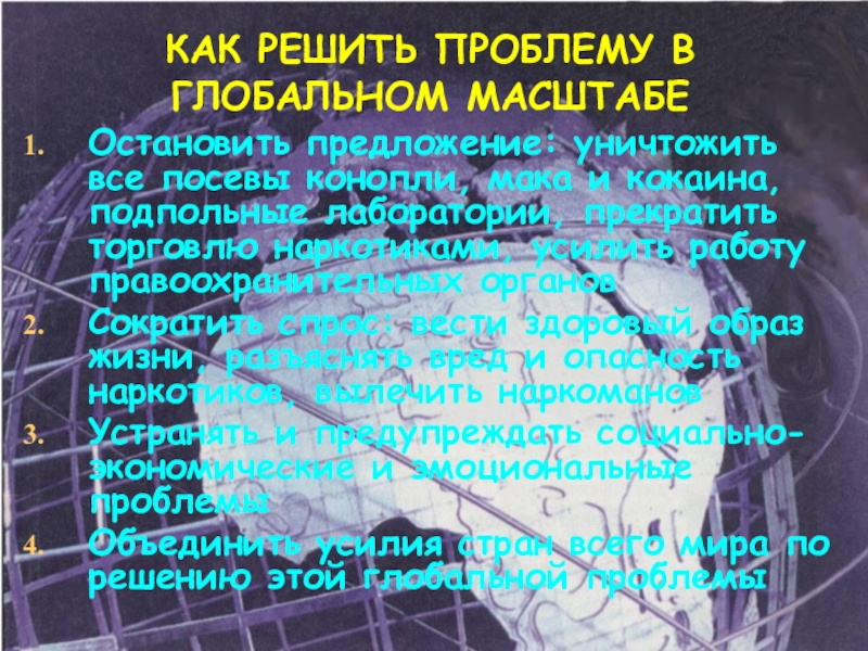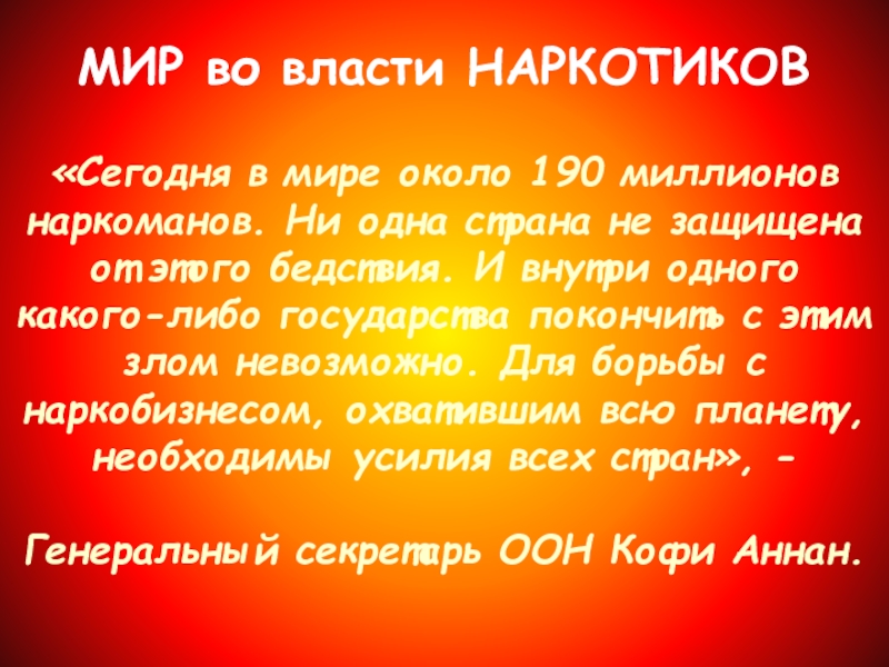 защищена от этого бедствия. И внутри одного какого-либо государства покончить с этим злом невозможно. Для борьбы с наркобизнесом, охватившим всю планету, необходимы усилия всех стран», -