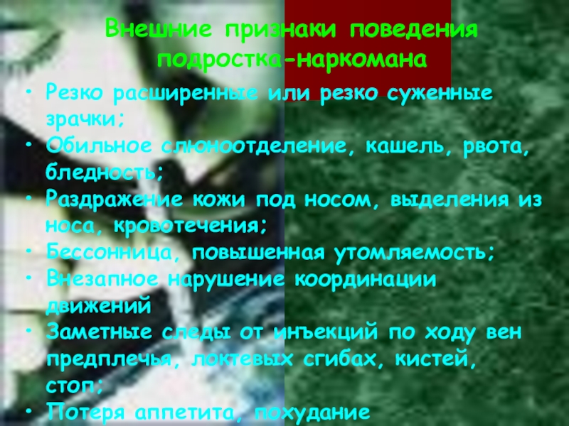 Слайд 10Внешние признаки поведения подростка-наркомана