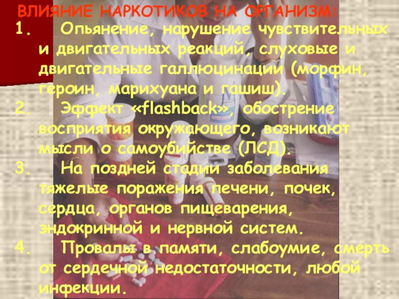 Слайд 8ВЛИЯНИЕ НАРКОТИКОВ НА ОРГАНИЗМ:
