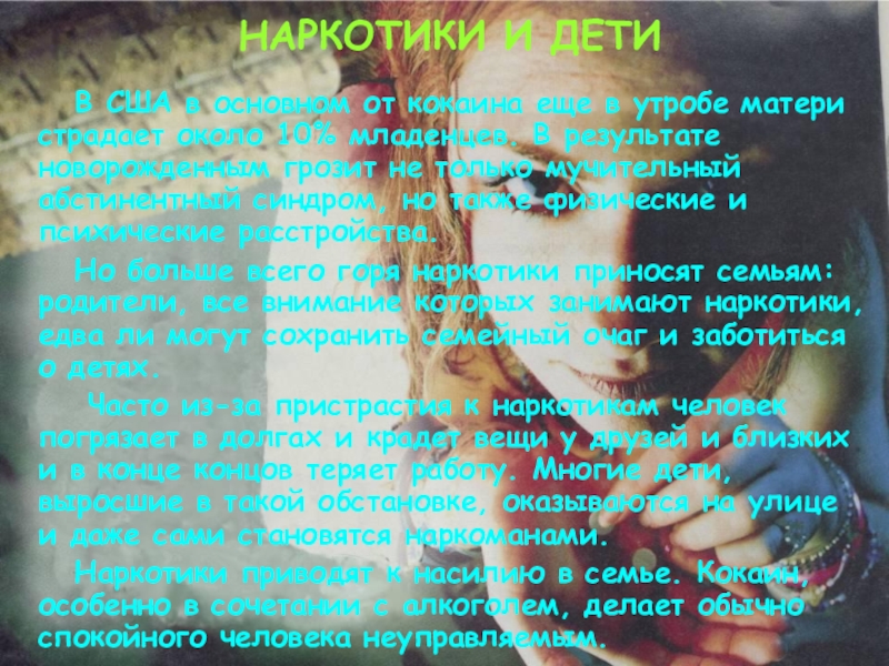 Но больше всего горя наркотики приносят семьям: родители, все внимание которых занимают наркотики, едва ли могут сохранить семейный очаг и заботиться о детях.