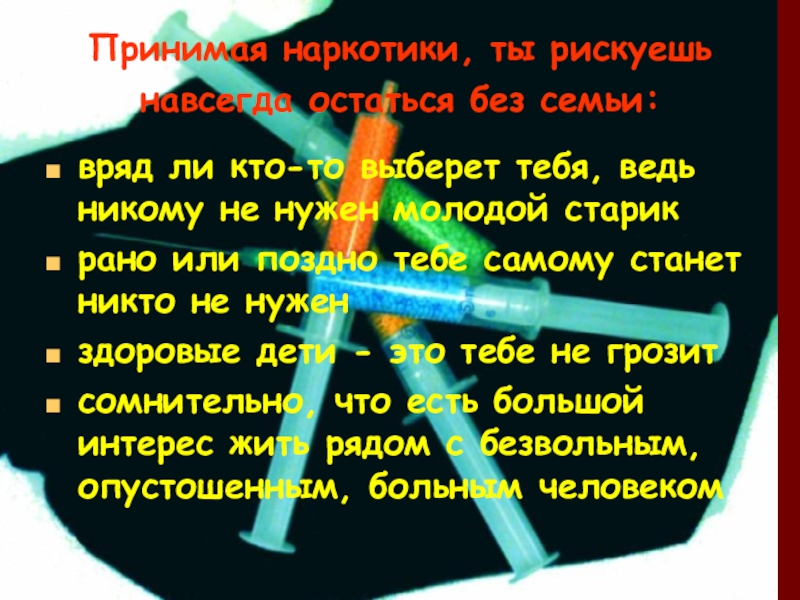 Слайд 11Принимая наркотики, ты рискуешь навсегда остаться без семьи: