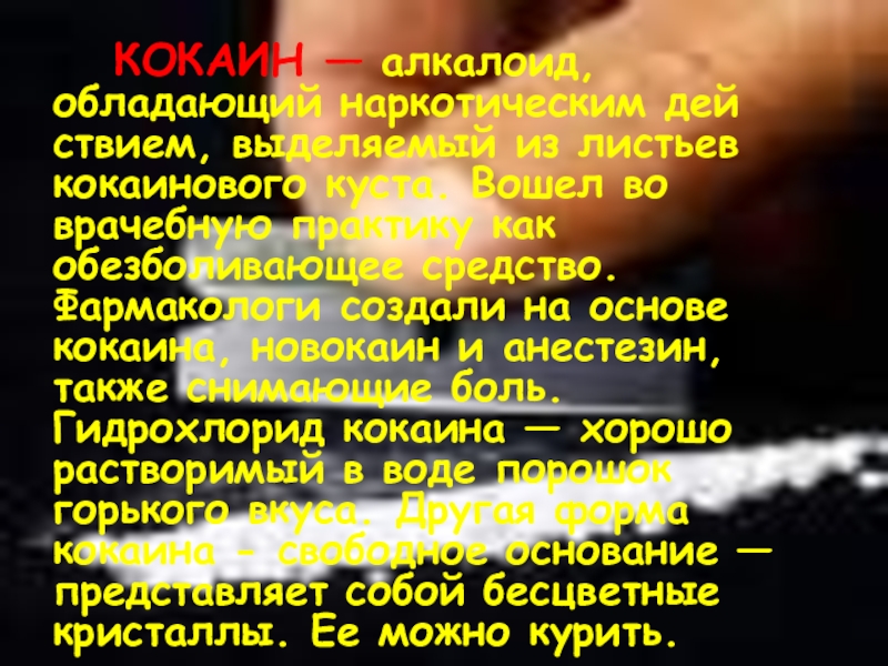 Слайд 5КОКАИН — алкалоид, обладающий наркотическим действием, выделяемый из листьев кокаинового куста.