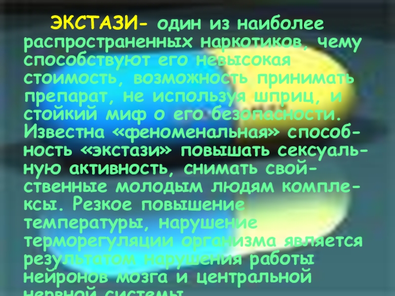Слайд 6ЭКСТАЗИ- один из наиболее распространенных наркотиков, чему способствуют его невысокая стоимость,