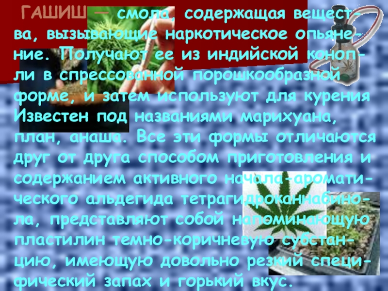 Слайд 4ГАШИШ — смола, содержащая вещест-ва, вызывающие наркотическое опьяне-ние. Получают ее из
