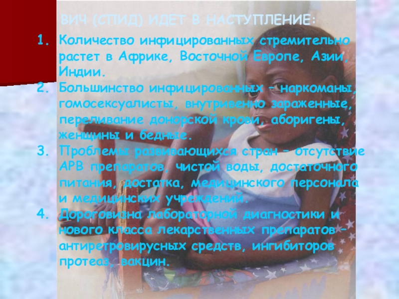 Проблемы развивающихся стран – отсутствие АРВ препаратов, чистой воды, достаточного питания, достатка, медицинского персонала и медицинских учреждений.