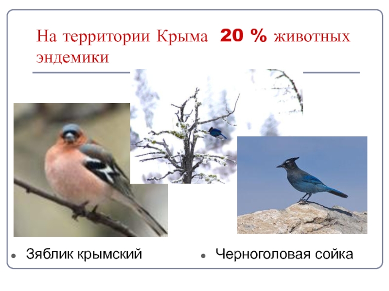 На территории Крыма 20 % животных эндемики Зяблик крымскийЧерноголовая сойка