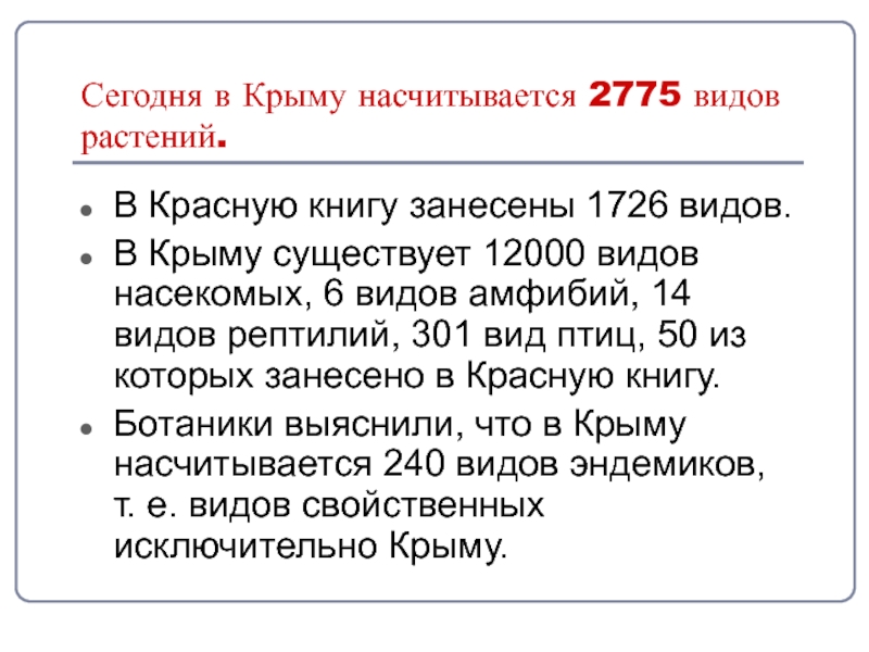 Сегодня в Крыму насчитывается 2775 видов растений.В Красную книгу занесены 1726 видов.В Крыму существует 12000 видов насекомых,