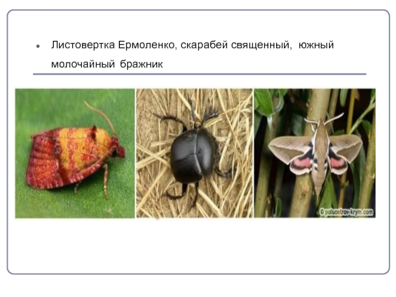 Слайд 28Листовертка Ермоленко, скарабей священный, южный молочайный бражник