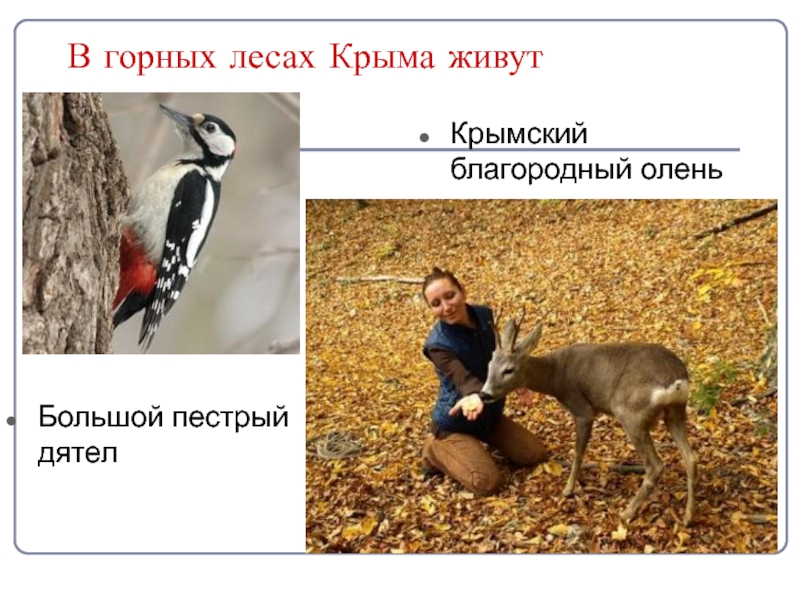 В горных лесах Крыма живутБольшой пестрый дятелКрымский благородный олень