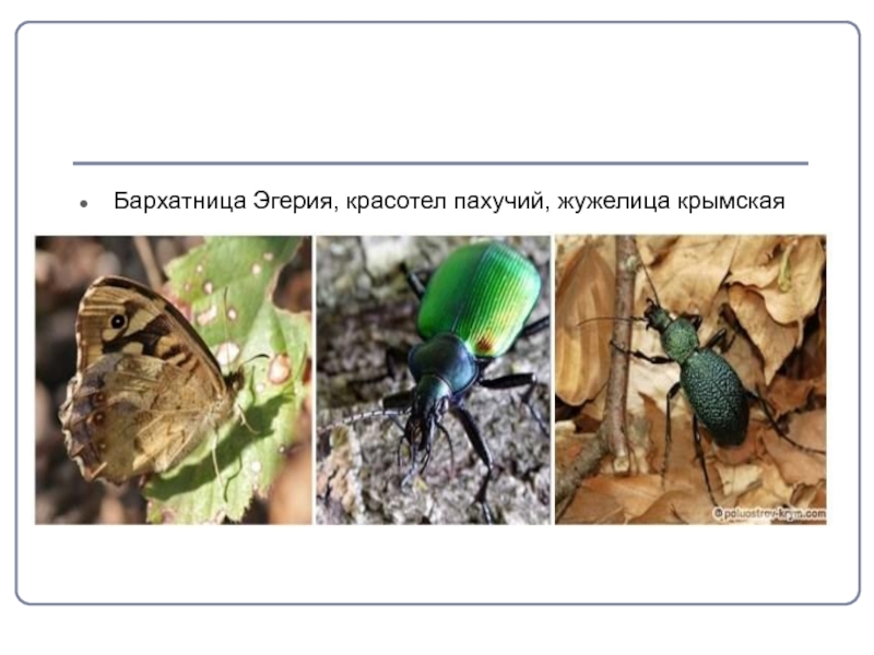 Слайд 26Бархатница Эгерия, красотел пахучий, жужелица крымская