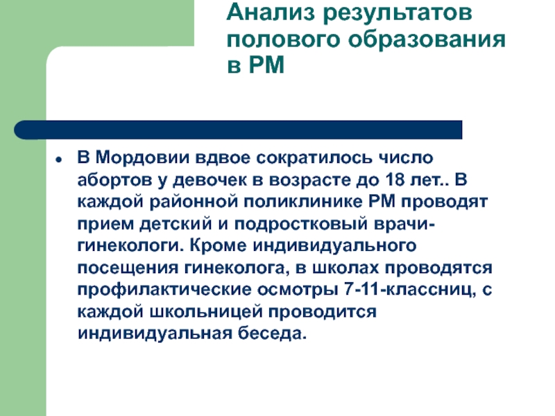 В Мордовии вдвое сократилось число абортов у девочек в возрасте до 18 лет.. В каждой районной поликлинике РМ проводят прием детский и подростковый врачи-гинекологи. Кроме индивидуального посещения гинеколога, в школах проводятся профилактические осмотры 7-11-классниц, с каждой школьницей проводится индивидуальная беседа.