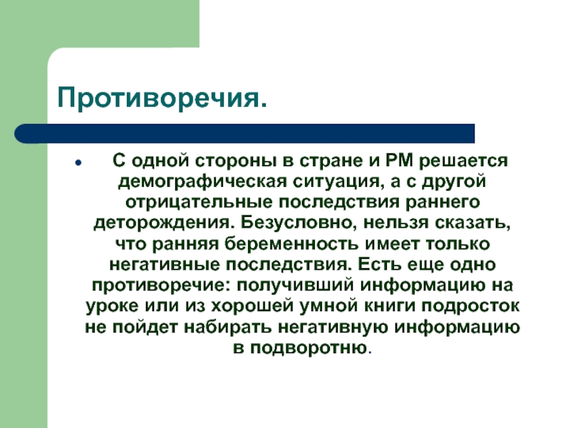 демографическая ситуация, а с другой отрицательные последствия раннего деторождения. Безусловно, нельзя сказать, что ранняя беременность имеет только негативные последствия. Есть еще одно противоречие: получивший информацию на уроке или из хорошей умной книги подросток не пойдет набирать негативную информацию в подворотню.