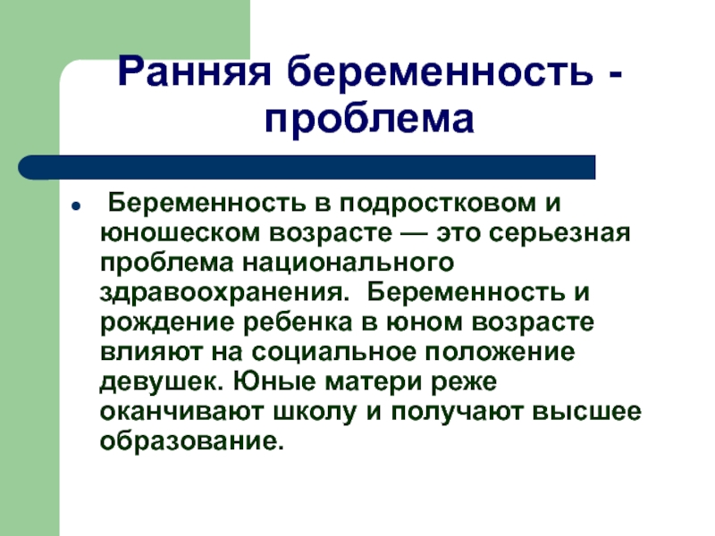 это серьезная проблема национального здравоохранения. Беременность и рождение ребенка в юном возрасте влияют на социальное положение девушек. Юные матери реже оканчивают школу и получают высшее образование.