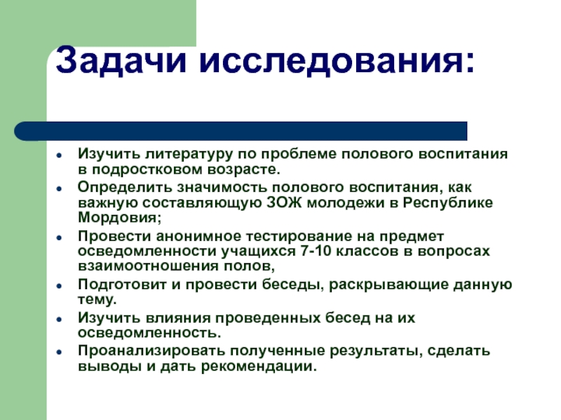 Изучить литературу по проблеме полового воспитания в подростковом возрасте.