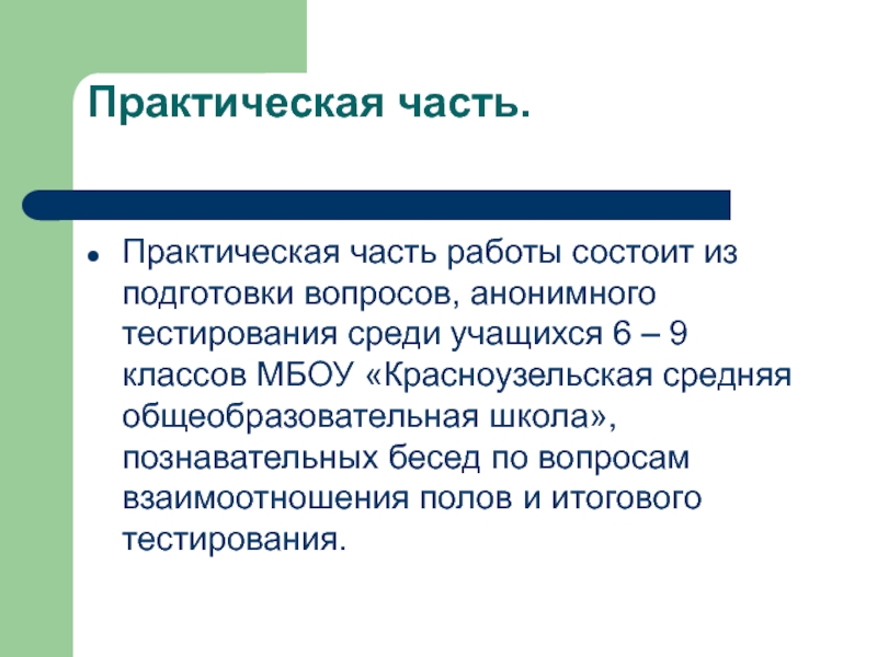 Практическая часть работы состоит из подготовки вопросов, анонимного тестирования среди