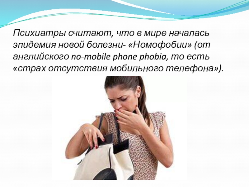 Слайд 3Психиатры считают, что в мире началась эпидемия новой болезни- «Номофобии» (от