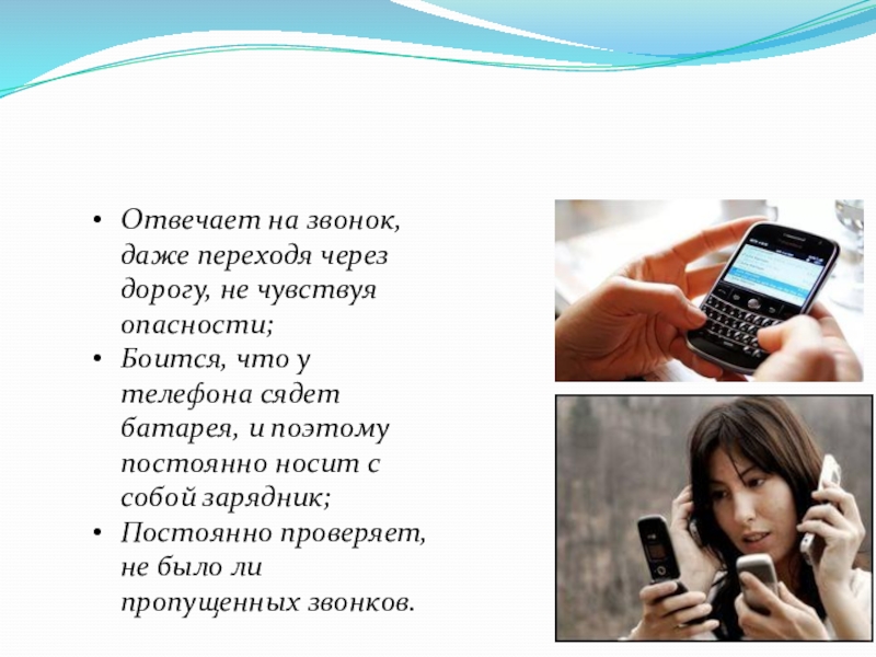 Слайд 14Отвечает на звонок, даже переходя через дорогу, не чувствуя опасности;