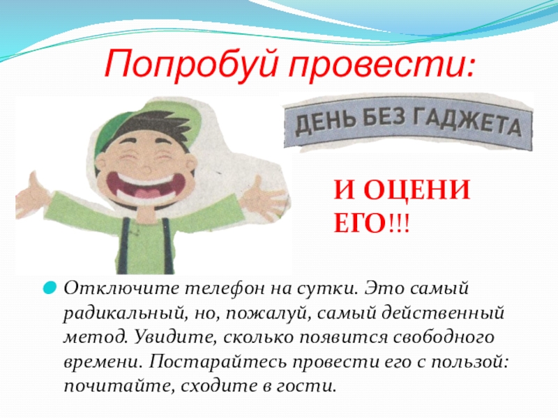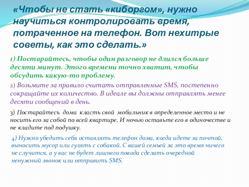 Слайд 22«Чтобы не стать «киборгом», нужно научиться контролировать время, потраченное на телефон.