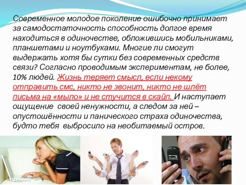 Слайд 8Современное молодое поколение ошибочно принимает за самодостаточность способность долгое время находиться