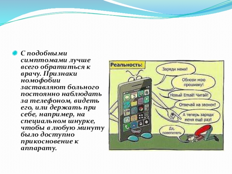 Слайд 16С подобными симптомами лучше всего обратиться к врачу. Признаки номофобии заставляют