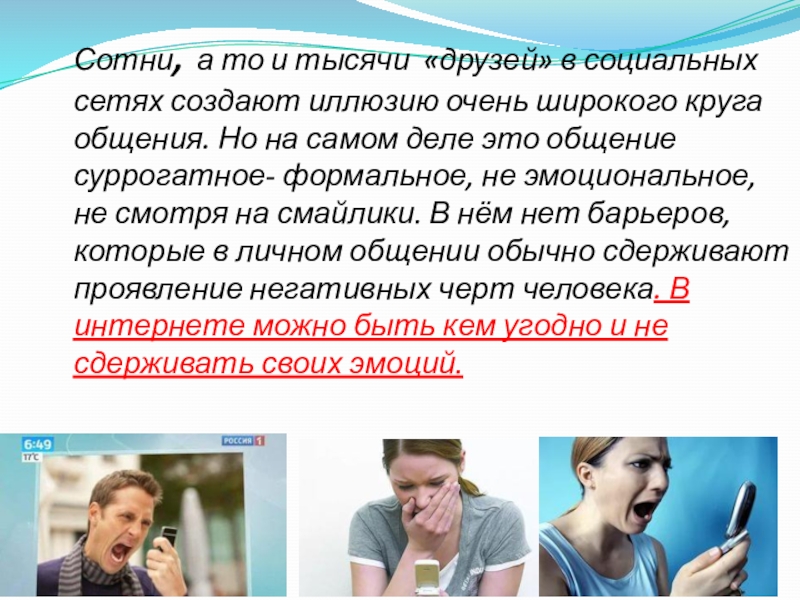 очень широкого круга общения. Но на самом деле это общение суррогатное- формальное, не эмоциональное, не смотря на смайлики. В нём нет барьеров, которые в личном общении обычно сдерживают проявление негативных черт человека. В интернете можно быть кем угодно и не сдерживать своих эмоций.