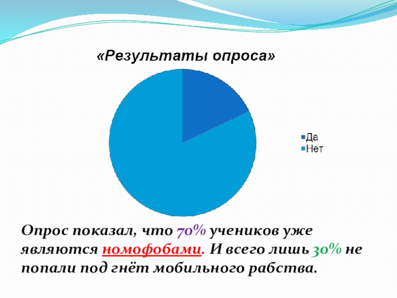 Слайд 20Опрос показал, что 70% учеников уже являются номофобами. И всего лишь
